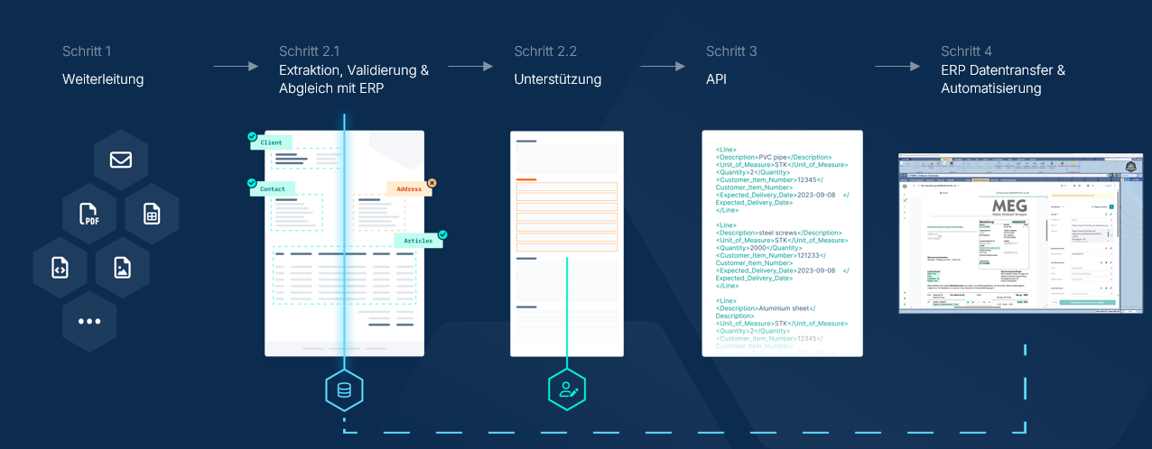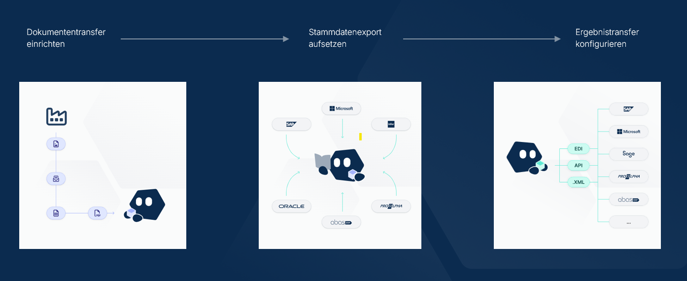 • Abgleich mit ERP: Über Standardschnittstellen wie EDI oder API wird die strukturierte Datenausgabe zuverlässig ins ERP-System übertragen